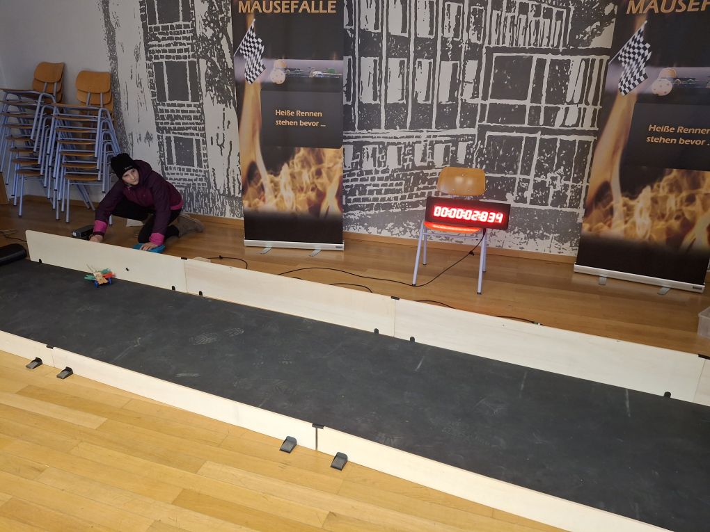 In der letzten Novemberwoche fand in der Aula das von unserem Physiklehrer Herr Eigler geleitete Mausefallenrennen statt. Die drei Technikklassen 8a, 9a und 9cI nahmen in verschiedenen (Renn-)Gruppen mit ihren selbstgebauten Autos daran teil.