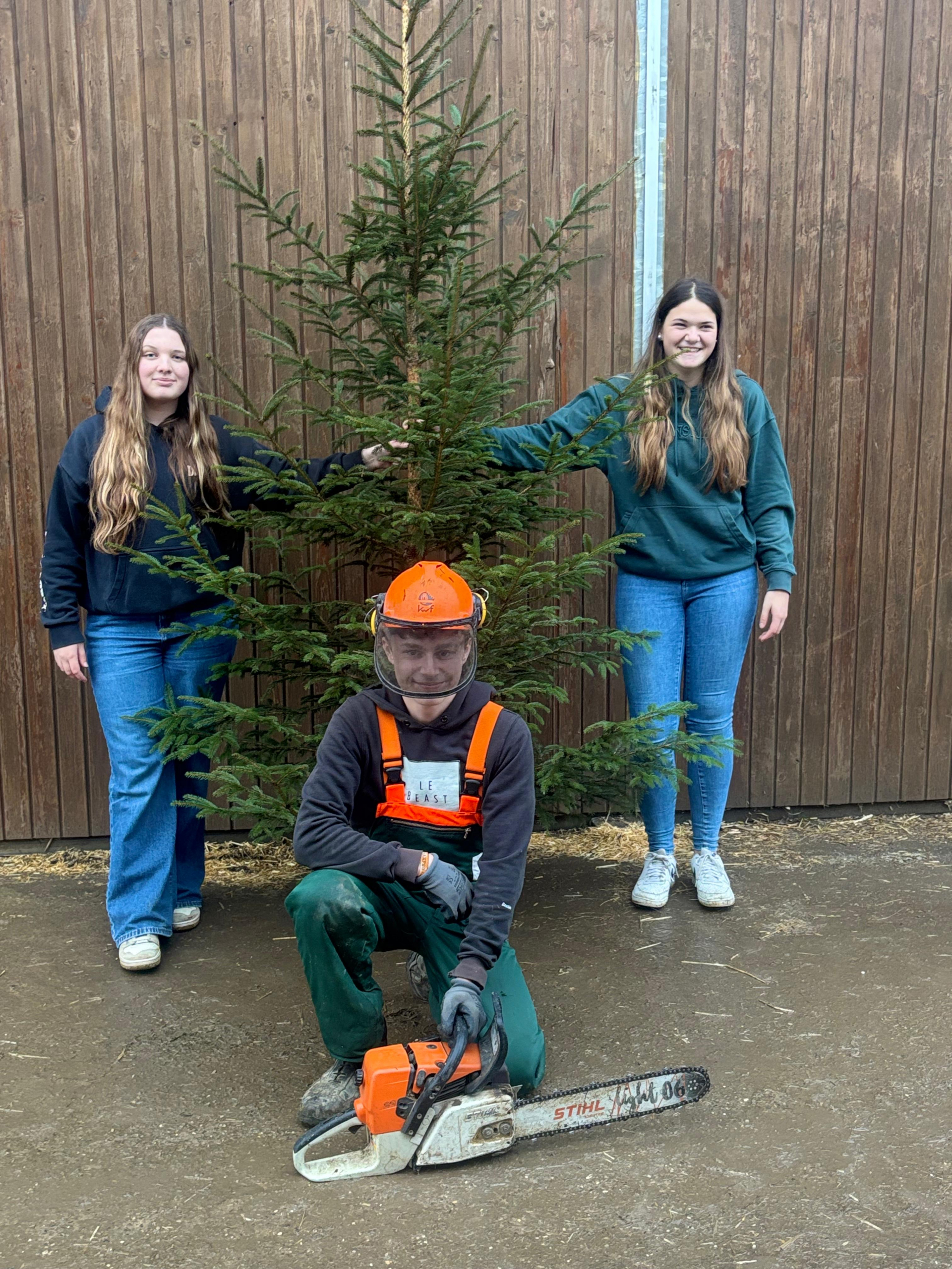 Schülersprecher Tom Langohr und die beiden SMV-Mitgliederinnen Sam Prast und Lea Reichert haben gemeinsam für Eingangsbereich einen schönen Baum gefällt, ihn aufgestellt und festlich geschmückt.
