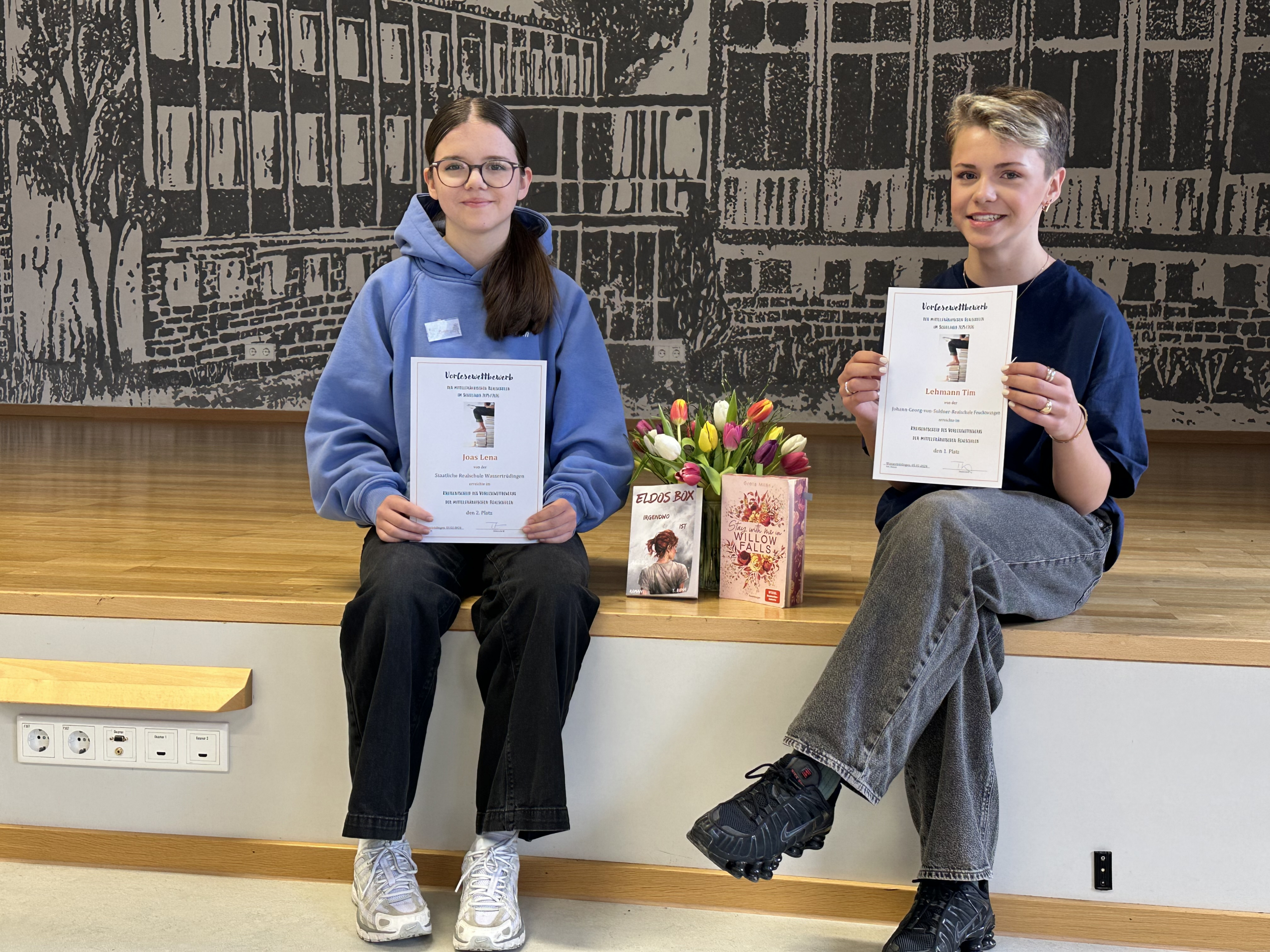Alle Teilnehmer gaben ihr Bestes gegeben und zeigten, dass sie ihren Platz in diesem Wettbewerb verdient hatten. Obwohl alle Mitstreiter wunderbare Leistungen erbracht hatten, wurden am Ende zwei Gewinner festgelegt. Den ersten Platz belegte dabei Tim Lehmann von der RS Feuchtwangen mit dem Buch „Stay with me in Willow Falls“ von Greta Milán. Mit seiner gelungenen Überleitung und dem gut betonten Lesen überzeugte er die Jury. Den zweiten Platz erzielte eine Teilnehmerin unserer Schule, Lena Joas, mit dem Buch „Irgendwo ist alles“ von Thilo Biena. Mit ihrer flüssigen Art des Lesens und ihrem gut improvisierten Vortrag im ungeübten Text gewann sie viele Stimmen für sich.