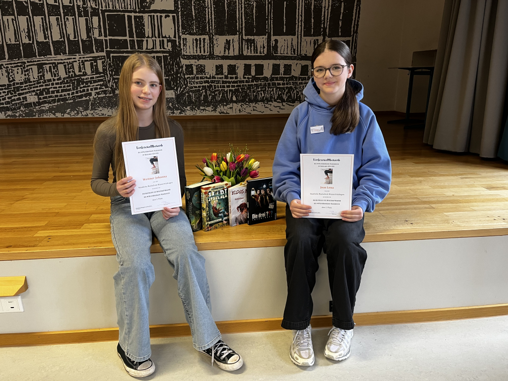 Alle Teilnehmer gaben ihr Bestes gegeben und zeigten, dass sie ihren Platz in diesem Wettbewerb verdient hatten. Obwohl alle Mitstreiter wunderbare Leistungen erbracht hatten, wurden am Ende zwei Gewinner festgelegt. Den ersten Platz belegte dabei Tim Lehmann von der RS Feuchtwangen mit dem Buch „Stay with me in Willow Falls“ von Greta Milán. Mit seiner gelungenen Überleitung und dem gut betonten Lesen überzeugte er die Jury. Den zweiten Platz erzielte eine Teilnehmerin unserer Schule, Lena Joas, mit dem Buch „Irgendwo ist alles“ von Thilo Biena. Mit ihrer flüssigen Art des Lesens und ihrem gut improvisierten Vortrag im ungeübten Text gewann sie viele Stimmen für sich.