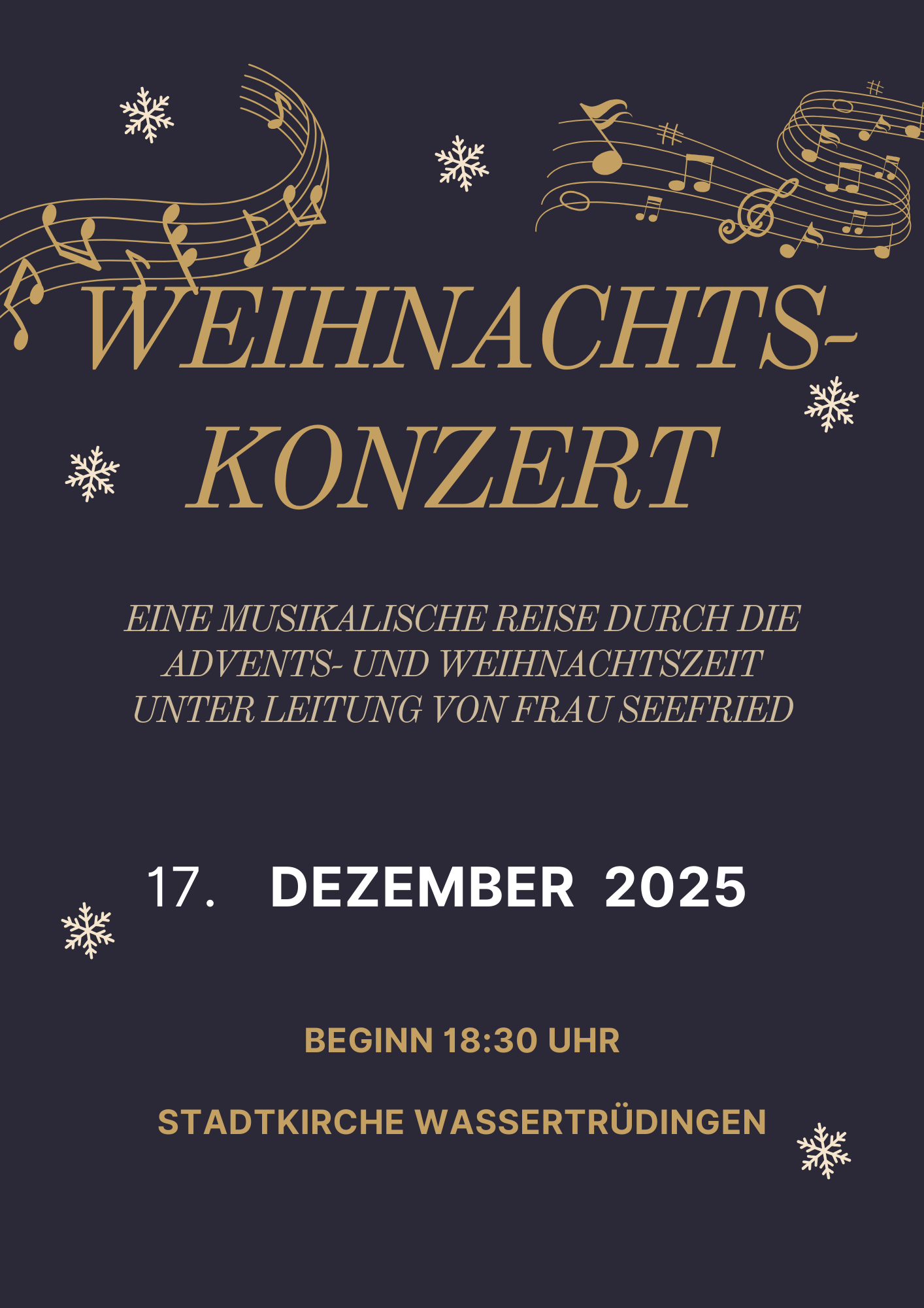 Am Mittwoch, den 17.Dezember findet um 18:30 Uhr in der Stadtkirche Wassertrüdingen das alljährliche Weihnachtskonzert statt. Bigband, Chor und Lehrerensembles haben auch dieses Jahr wieder weihnachtliche Stücke für Sie vorbereitet.