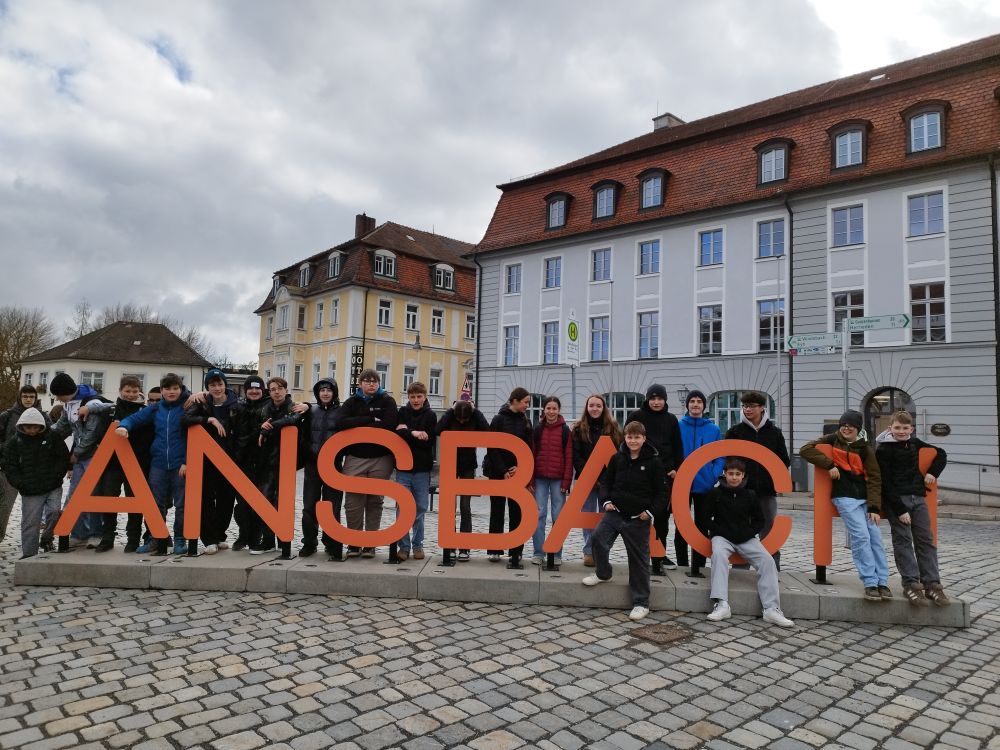 Ende März unternahmen alle achten Klassen einen spannenden Ausflug zur Ansbacher Residenz. Nach einer kurzen Zugfahrt und einem kleinen Fußmarsch erreichten die Schülerinnen und Schüler den Hofgarten. Dort konnten sie direkt die beeindruckende barocke Architektur der Orangerie bewundern – ein erster Vorgeschmack auf das, was sie an diesem Tag noch erwarten sollte.