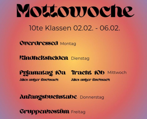 Auch in diesem Jahr fand die traditionelle Motto-Woche der 10. Klassen statt. An jedem Tag kamen die Schülerinnen und Schüler passend zu einem bestimmten Thema verkleidet in die Schule und sorgten damit für gute Stimmung.